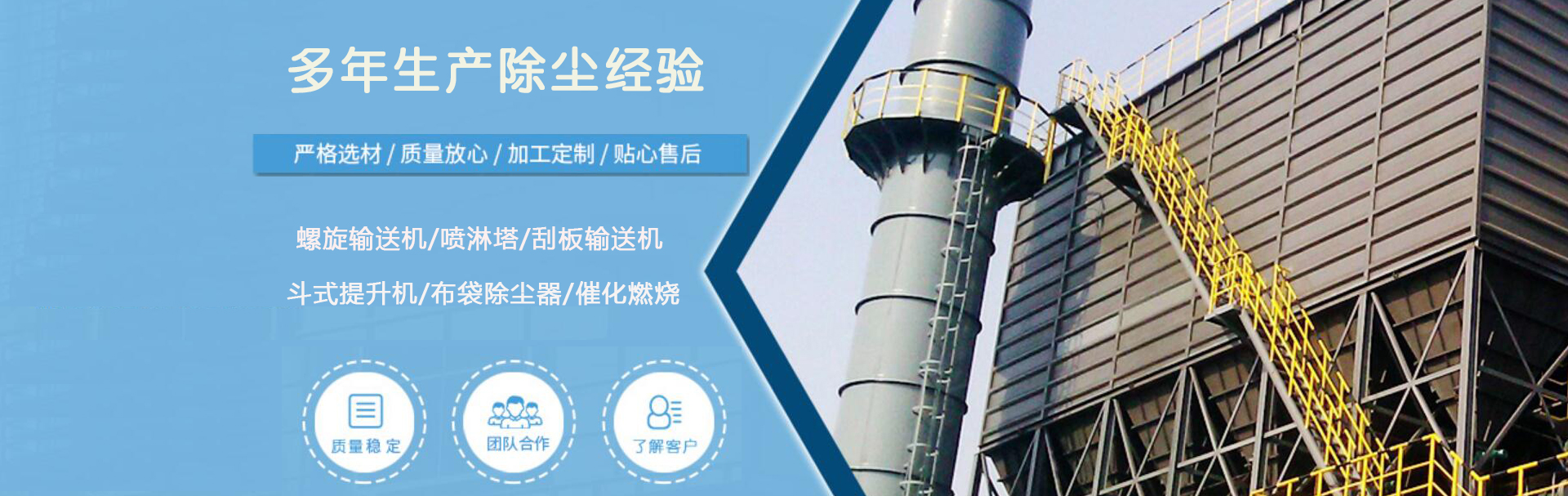 集科研、生產、加工、銷售為一體的企業,自創建以來,嚴抓產品質量,公司各種設備齊全,技術力量雄厚,是生產各種類型除塵設備及配件的廠家,產品主要有:布袋除塵器,螺旋輸送機噴淋塔,刮板輸送機,斗式提升機,催化燃燒。 始終堅持“以市場為導向、產學研相結合”的指導思想, 持續開展技術創新,不斷提高企業核心競爭力。